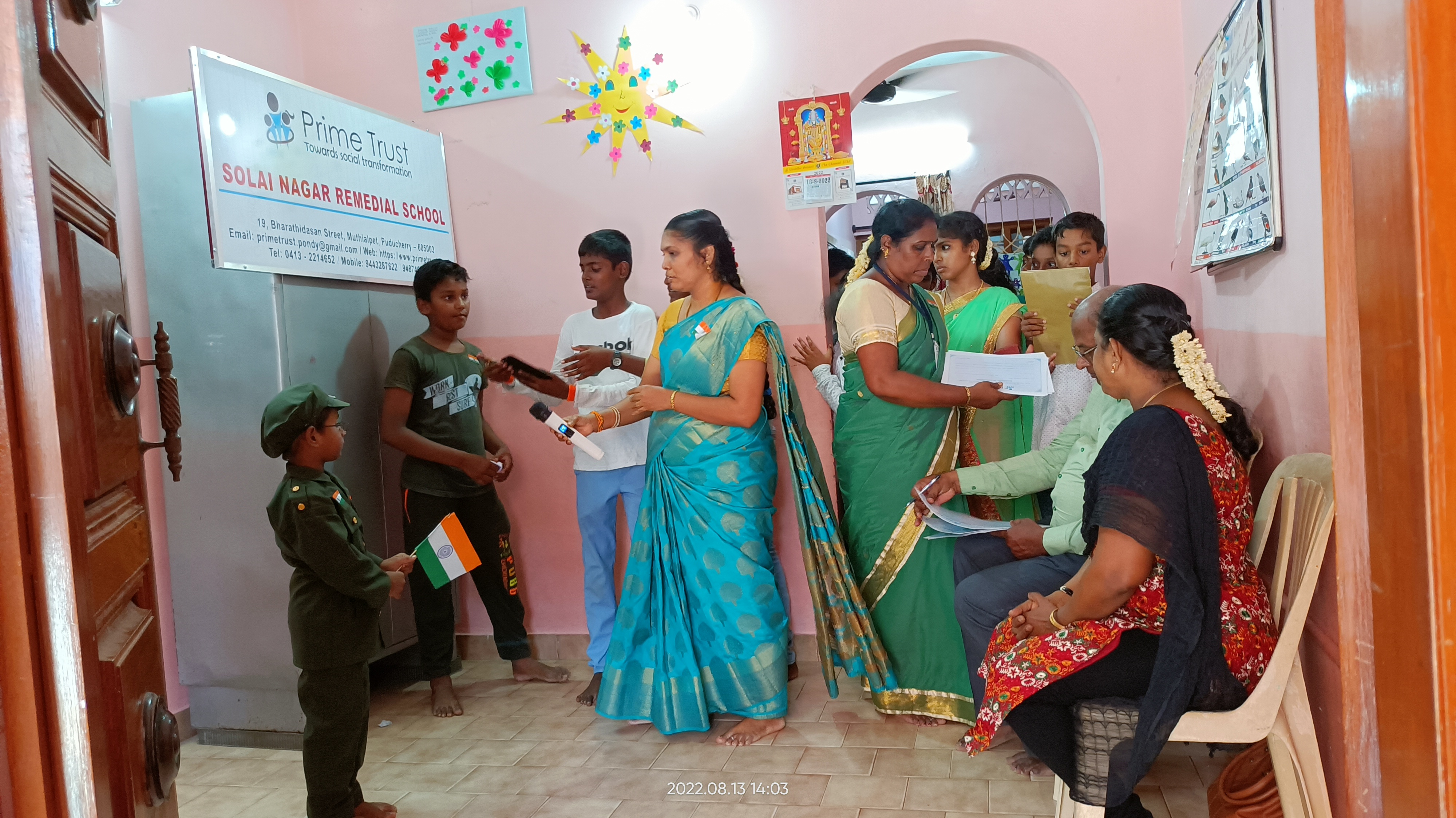 On Saturday the 13th August 2022, at 12:45 p.m, the Remedial School children at Muthialpet celebrated 75th Independence Day along with the staff members and Mr. S.M. Arasu, Founder Director, Prime Trust.